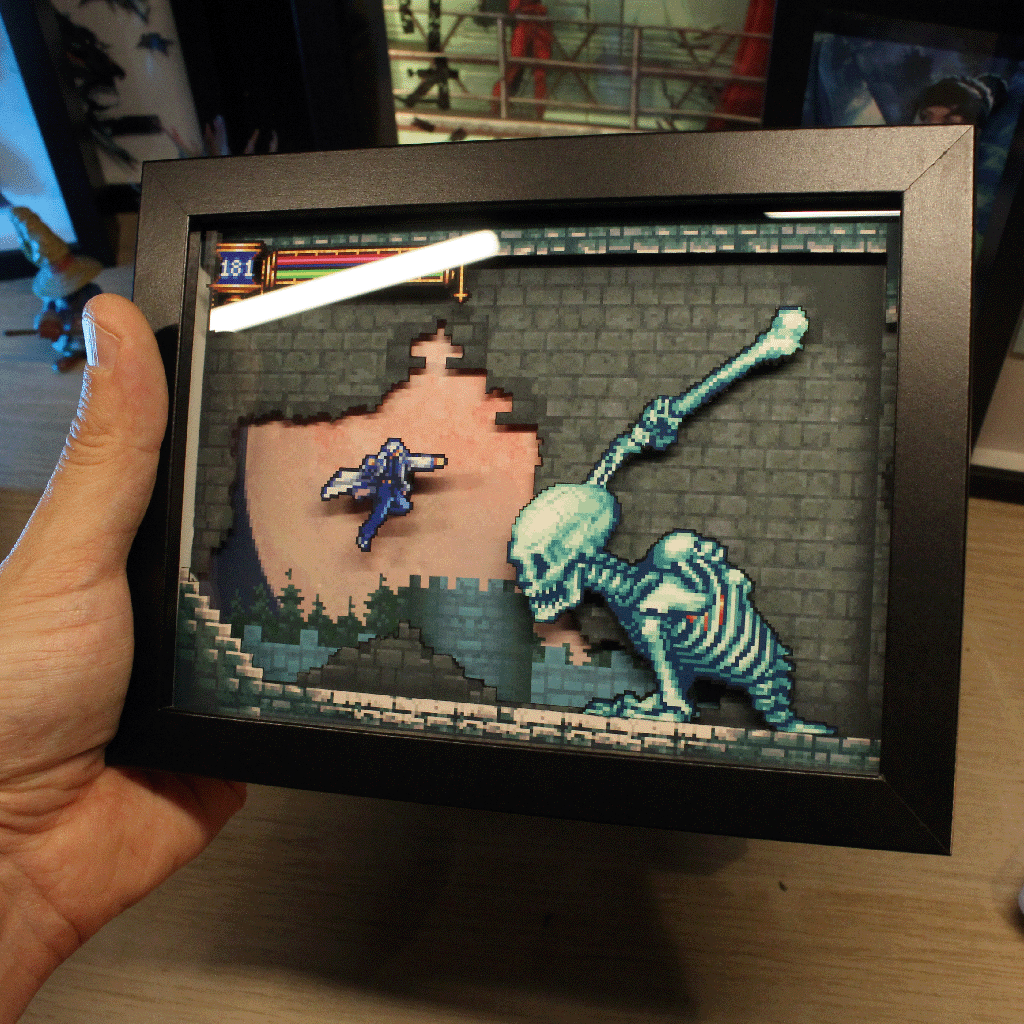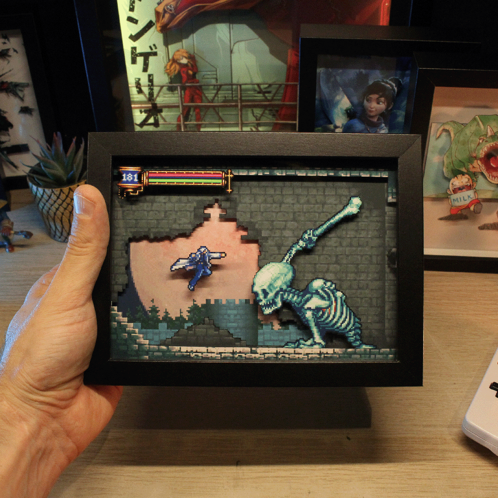 Ce décor en 3D met en scène l’affrontement iconique entre Soma Cruz et le gigantesque Squelette Colossal. Les différentes strates créent une profondeur spectaculaire, donnant l’impression que l’action s’échappe du cadre pour prendre vie sous vos yeux.