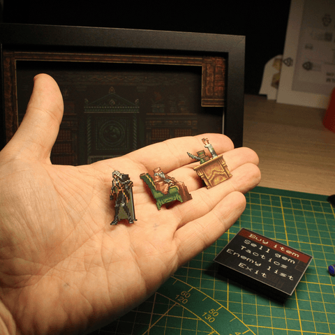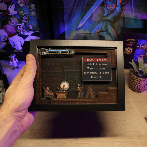 🕯️ Ce diorama met en scène une séquence culte du jeu : Alucard, héros iconique de la saga, face au mystérieux marchand, dans une salle gothique remplie de reliques et de secrets.