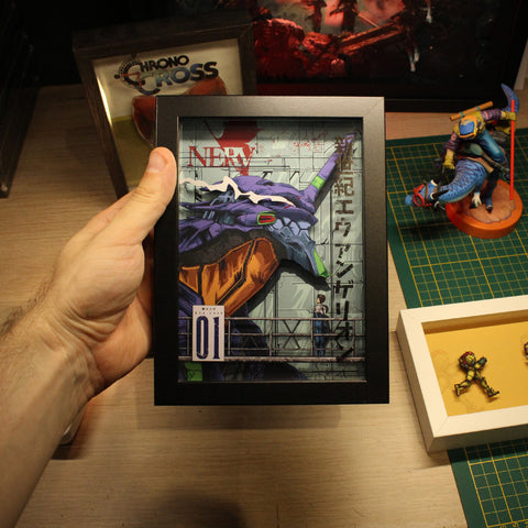 Ce diorama met en scène toute la puissance émotionnelle d’Evangelion : un jeune pilote solitaire, minuscule devant la silhouette colossale de l’EVA-01. Une composition en relief qui capte l’essence même de l’œuvre culte, idéale pour habiller vos murs de passion animée.
