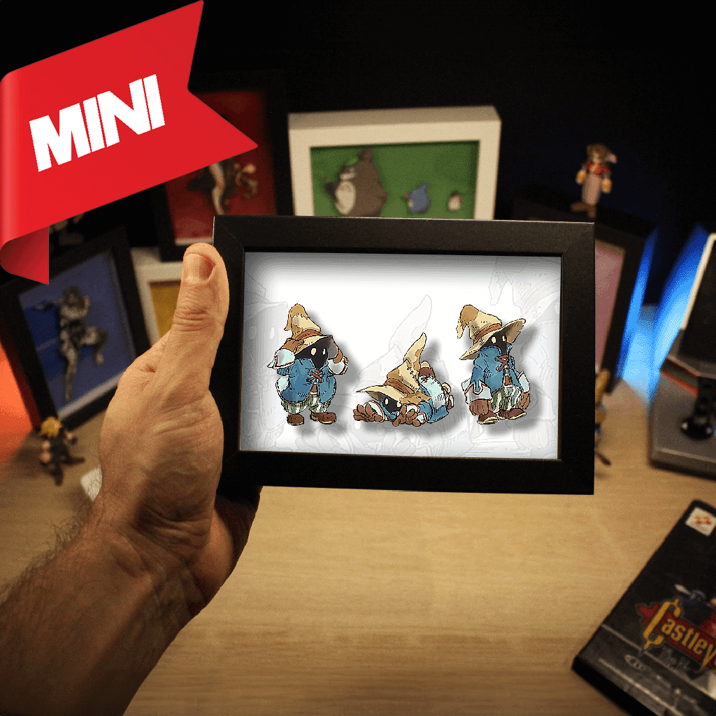 Ce diorama Pocket met en scène Vivi, le mage noir au chapeau trop grand, dans un décor inspiré de Final Fantasy IX. Son regard brillant, entre innocence et questionnement, évoque toute la magie et la mélancolie de ce chef-d’œuvre du RPG.