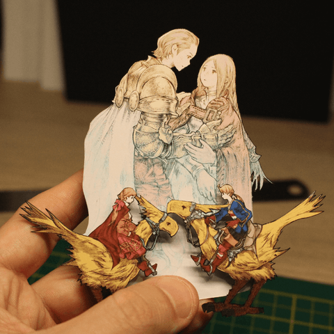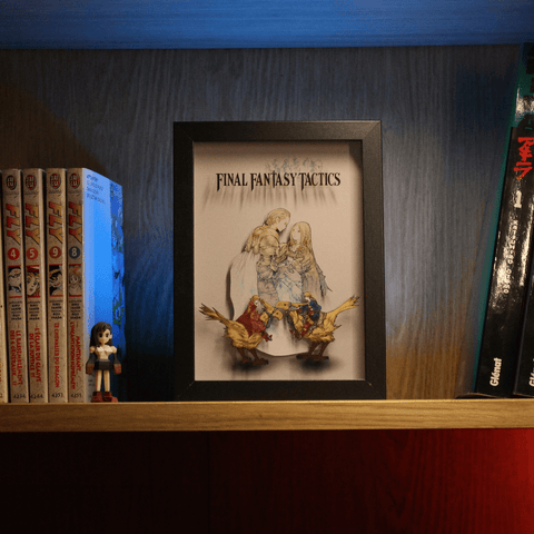 Ce diorama lumineux inspiré de Final Fantasy Tactics illustre une scène iconique : Delita et Ovelia, figés dans un moment suspendu entre tendresse et tragédie, tandis que deux jeunes guerriers montent fièrement leurs chocobos. Les personnages sont magnifiquement mis en relief, sublimant l’émotion et l’esthétique unique d'Ivalice.