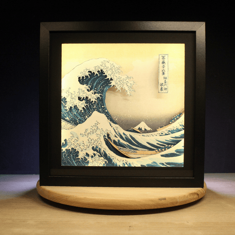 Admirez toute la puissance de "La Grande Vague de Kanagawa" à travers ce diorama lumineux, hommage vibrant à l'art intemporel d'Hokusai. Chaque mouvement d’écume et chaque trait de pinceau prennent du relief sous la lumière, capturant l’émotion brute de cette œuvre magistrale.