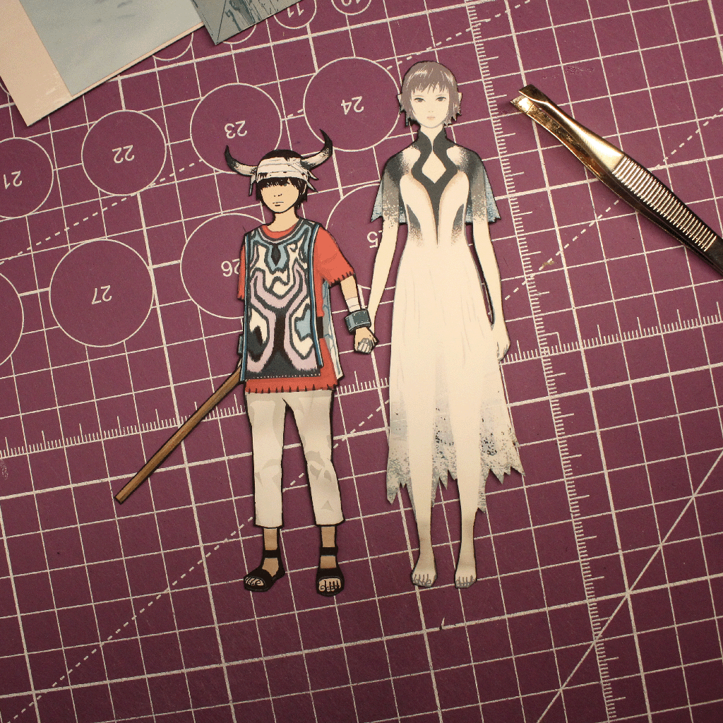 On y voit ICO, le jeune héros au casque, tenant la main de Yorda, l’éthérée princesse. Le décor, avec ses ruines et ses murs imposants, évoque la solitude et l'évasion. 🌑
