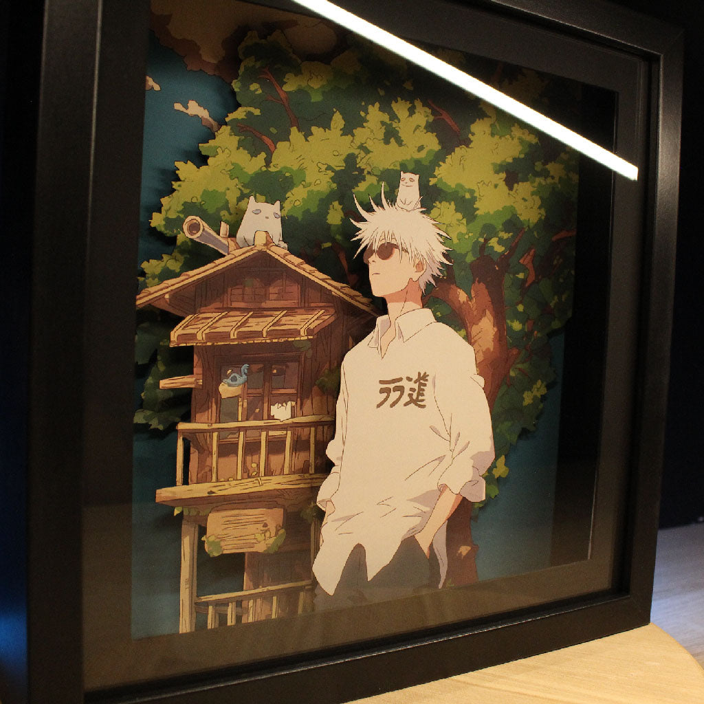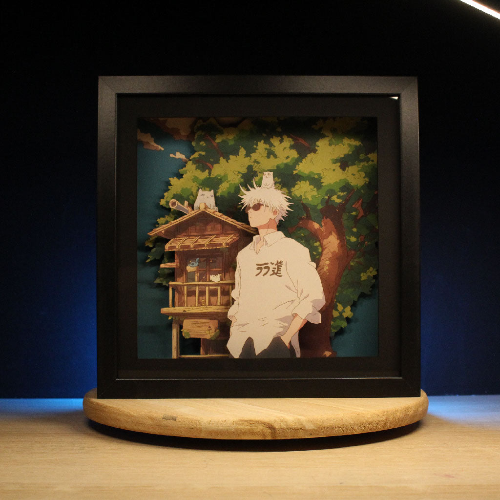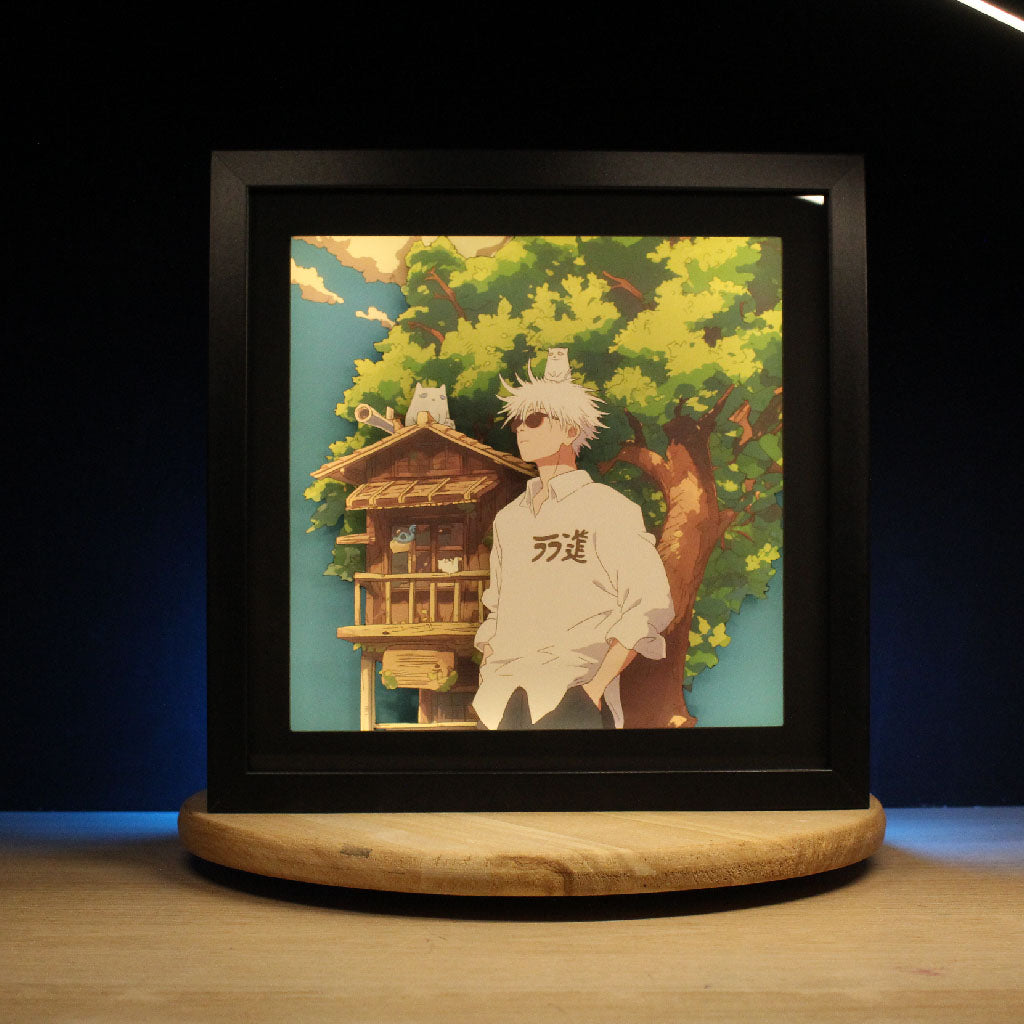 Ce diorama lumineux met en scène Gojo Satoru, hors des combats et loin du chaos, dans un moment rare de calme, entouré de chats et de verdure, devant une maison perchée sous un grand arbre.