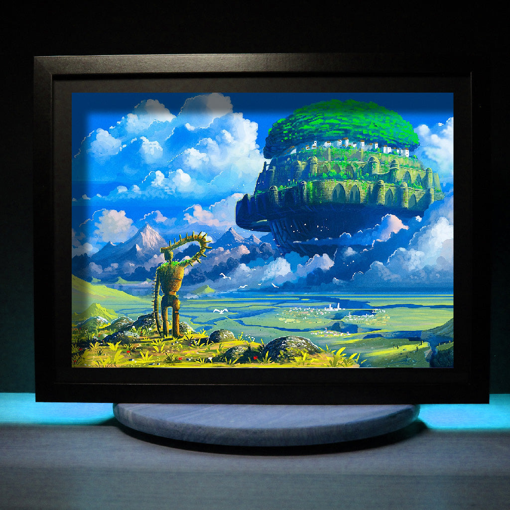 Redécouvrez la magie de "Le Château dans le ciel" avec ce diorama en relief inspiré du film culte de Hayao Miyazaki ✨. Grâce à ses couches superposées, l’île flottante de Laputa semble réellement suspendue au-dessus des nuages, tandis que le robot gardien veille paisiblement sur la nature 🌿.