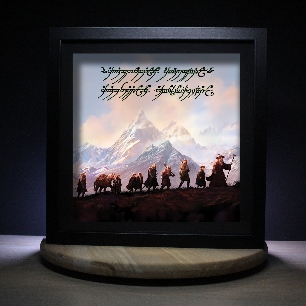 Ce cadre lumineux rend hommage à l’épopée de la Communauté de l'Anneau, où courage, et la fraternité se rencontrent au cœur des montagnes majestueuses. Les personnages emblématiques, allant de Frodo à Gandalf, sont illuminés dans un décor spectaculaire, capturant l'intensité et la grandeur de leur voyage. L'écriture en langue elfique ajoute une touche mystique, vous plongeant dans l'univers de Tolkien.