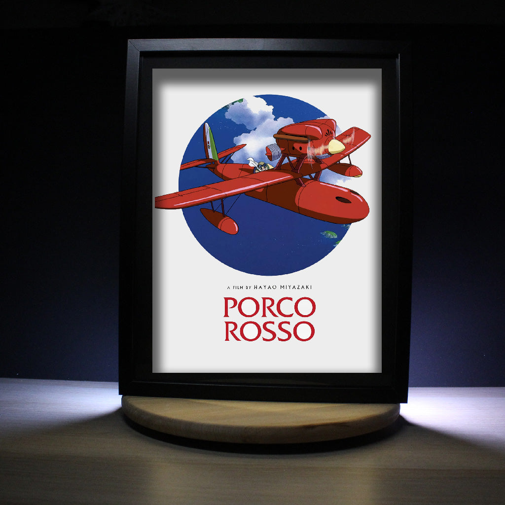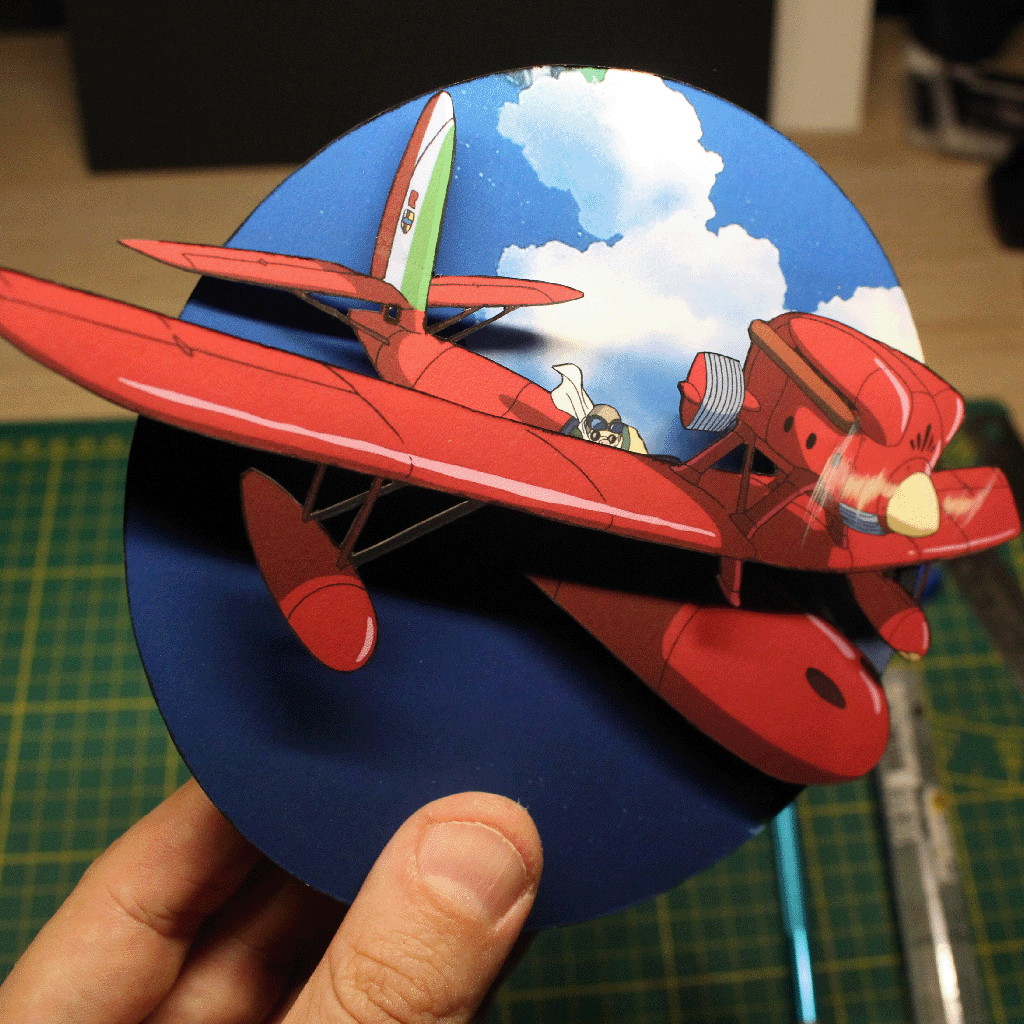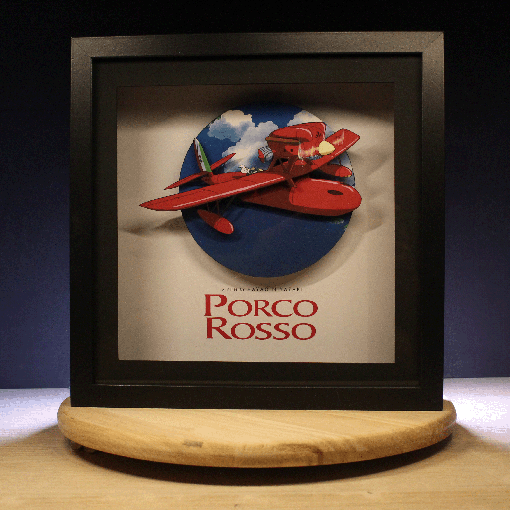 Cette magnifique diorama de Porco Rosso, met en scène un hydravion rouge fendant le ciel sous un fond bleu profond 🌌. Le héros, un ancien pilote devenu cochon anthropomorphe, symbolise la liberté, le courage et la solitude choisie 🐷.
