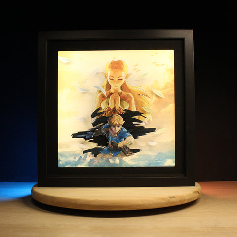 Ce diorama en relief inspiré de The Legend of Zelda: Breath of the Wild capture l’émotion intense entre Link et Zelda. Chaque détail, du regard déterminé de Link à la prière silencieuse de Zelda, est sublimé par des éléments flottants qui donnent vie à leur combat contre le destin. 🗡️🌸